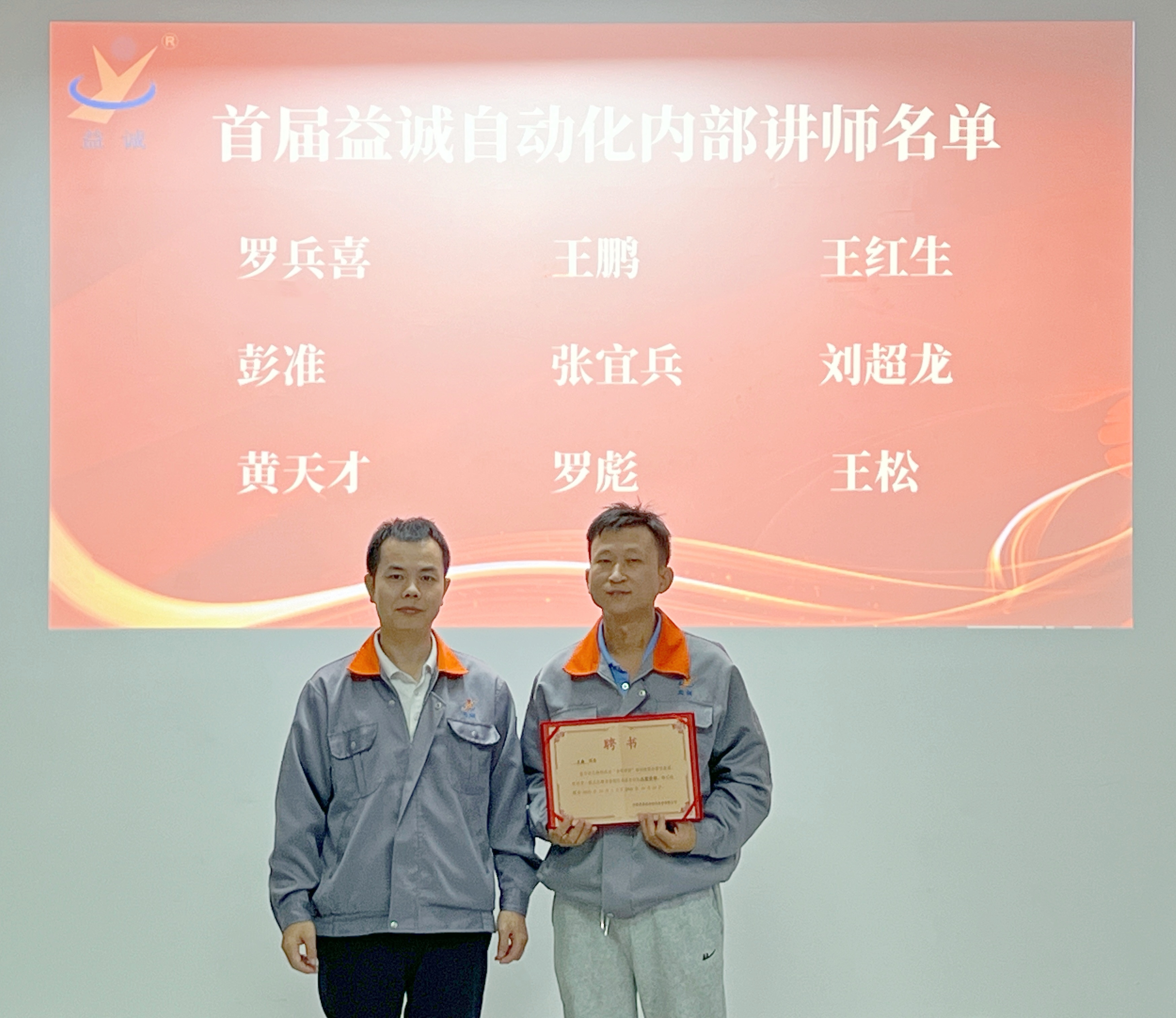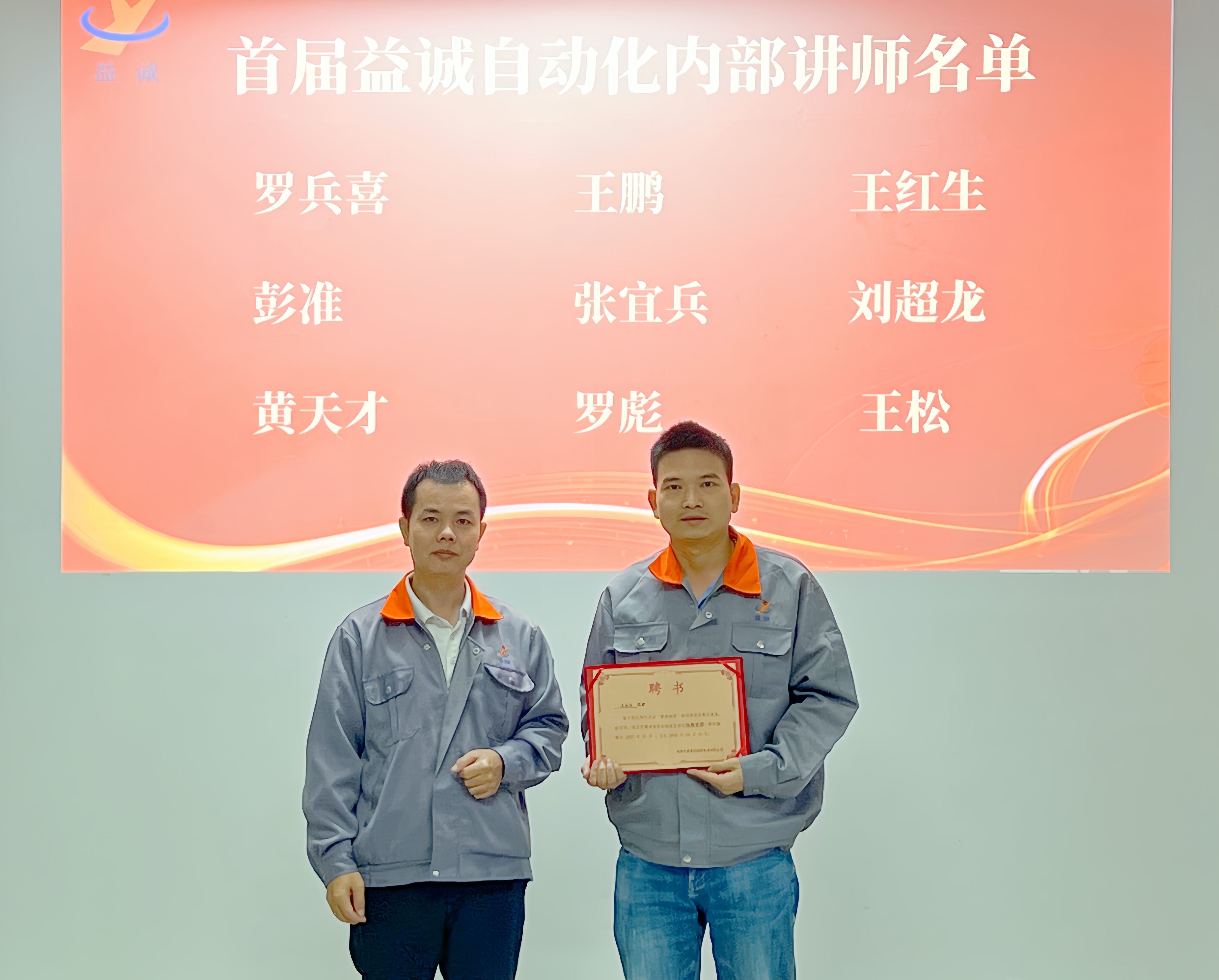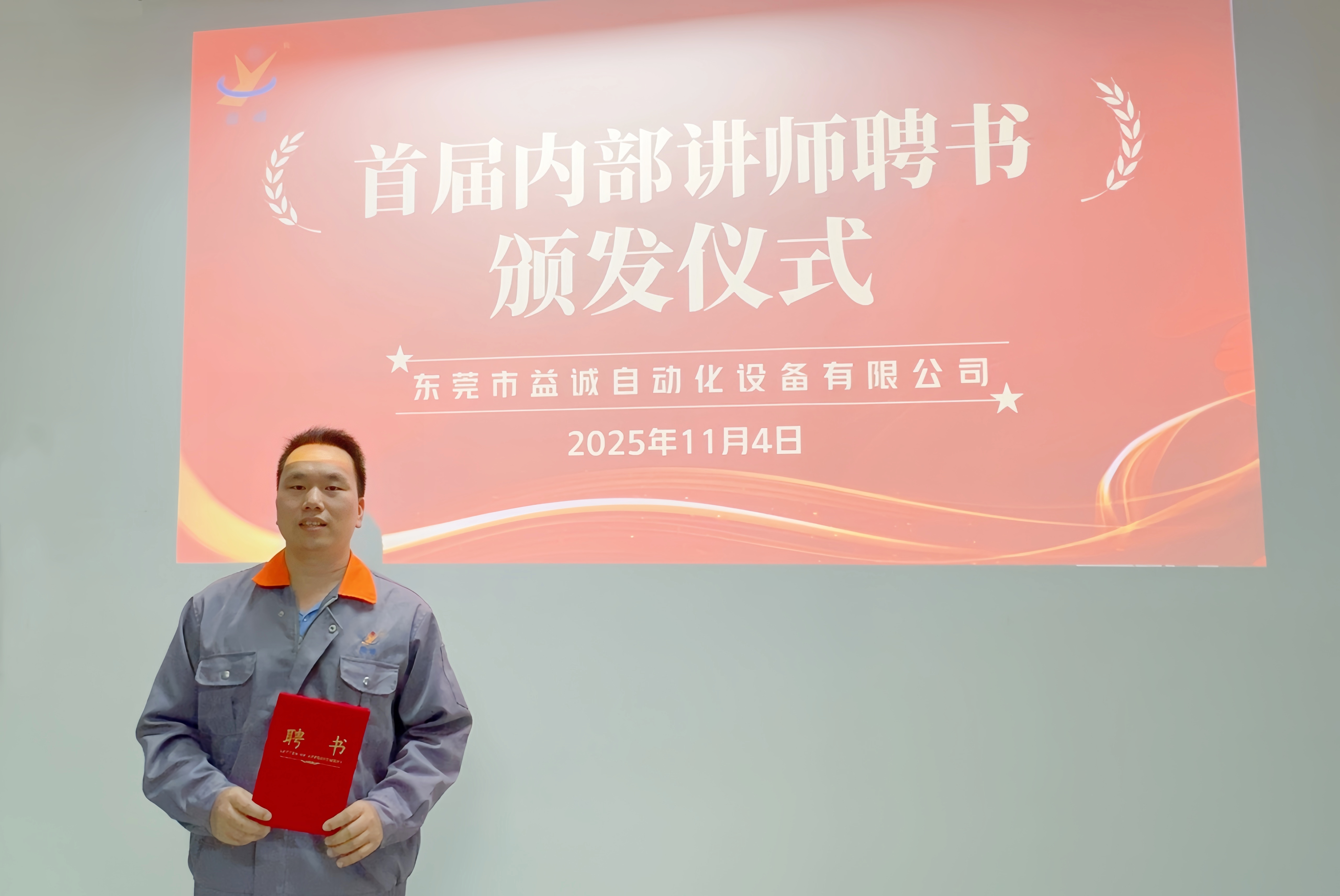 益誠(chéng)自動(dòng)化總經(jīng)理潘總親自為首批內(nèi)部講師頒發(fā)聘書,潘總勉勵(lì)大家:“這張聘書承載的不僅是榮譽(yù)與信任,更是責(zé)任與期待,希望大家成為公司智慧傳遞的橋梁,在教與學(xué)中激發(fā)思考,在傳與承中凝聚力量,為公司高質(zhì)量發(fā)展持續(xù)注入人才動(dòng)能。”